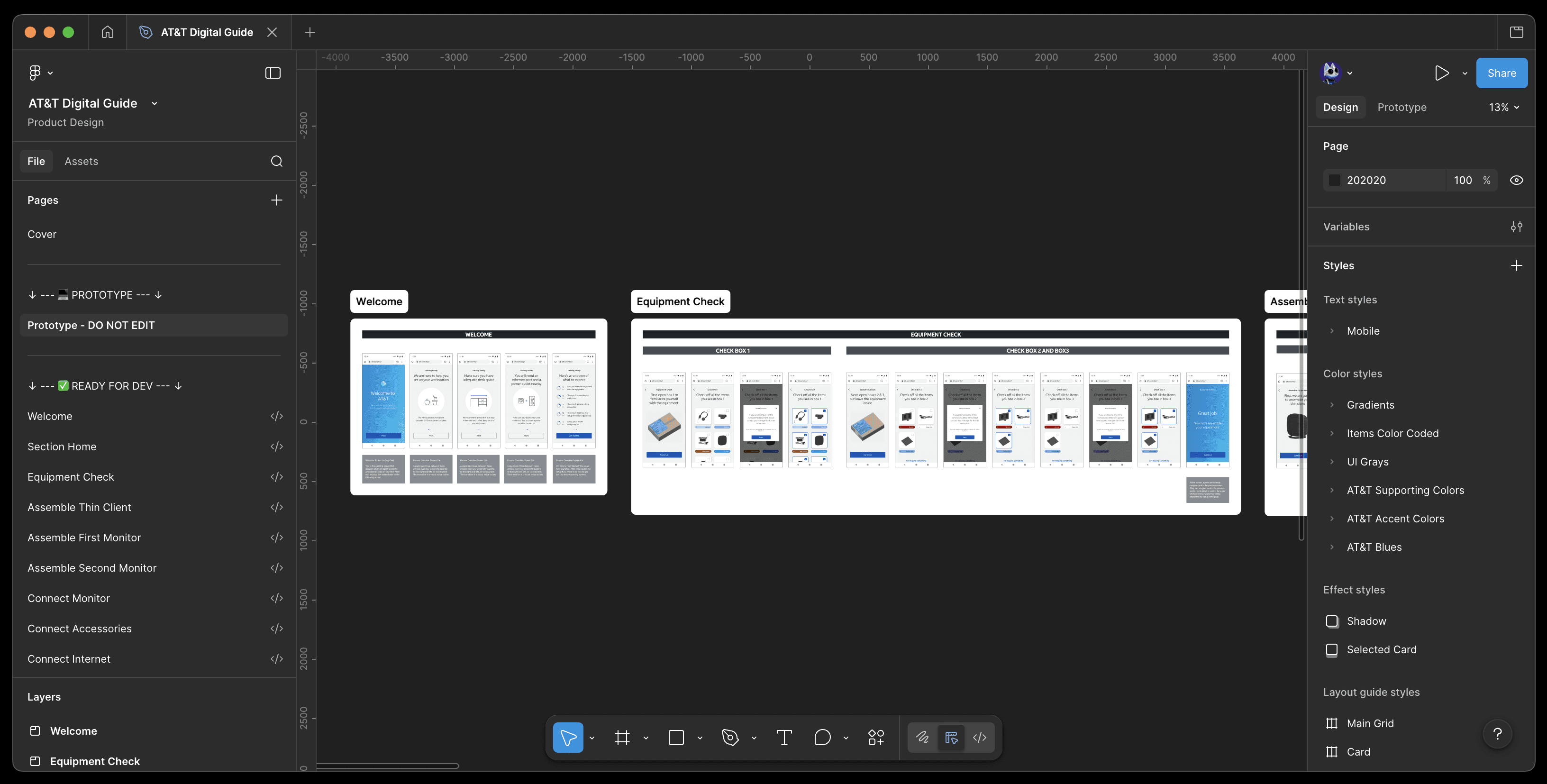 To validate the effectiveness of the AT&T Digital Guide, I developed interactive prototypes in Figma that simulated the full user experience. These prototypes included all key phases, from the Welcome Screens to Powering On Equipment, ensuring a comprehensive representation of the onboarding journey.