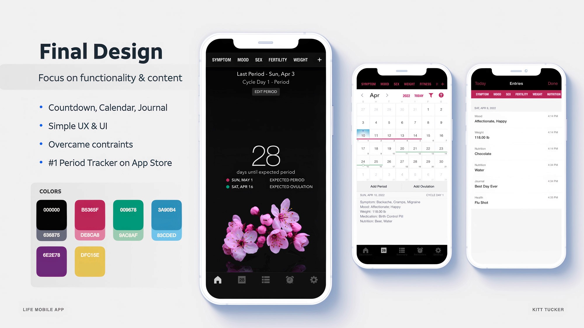 Recognition and Impact: The final iteration solidified Life’s position as the #1 Period Tracker on the App Store, celebrated for its simplicity, functionality, and ability to empower users with meaningful health insights.