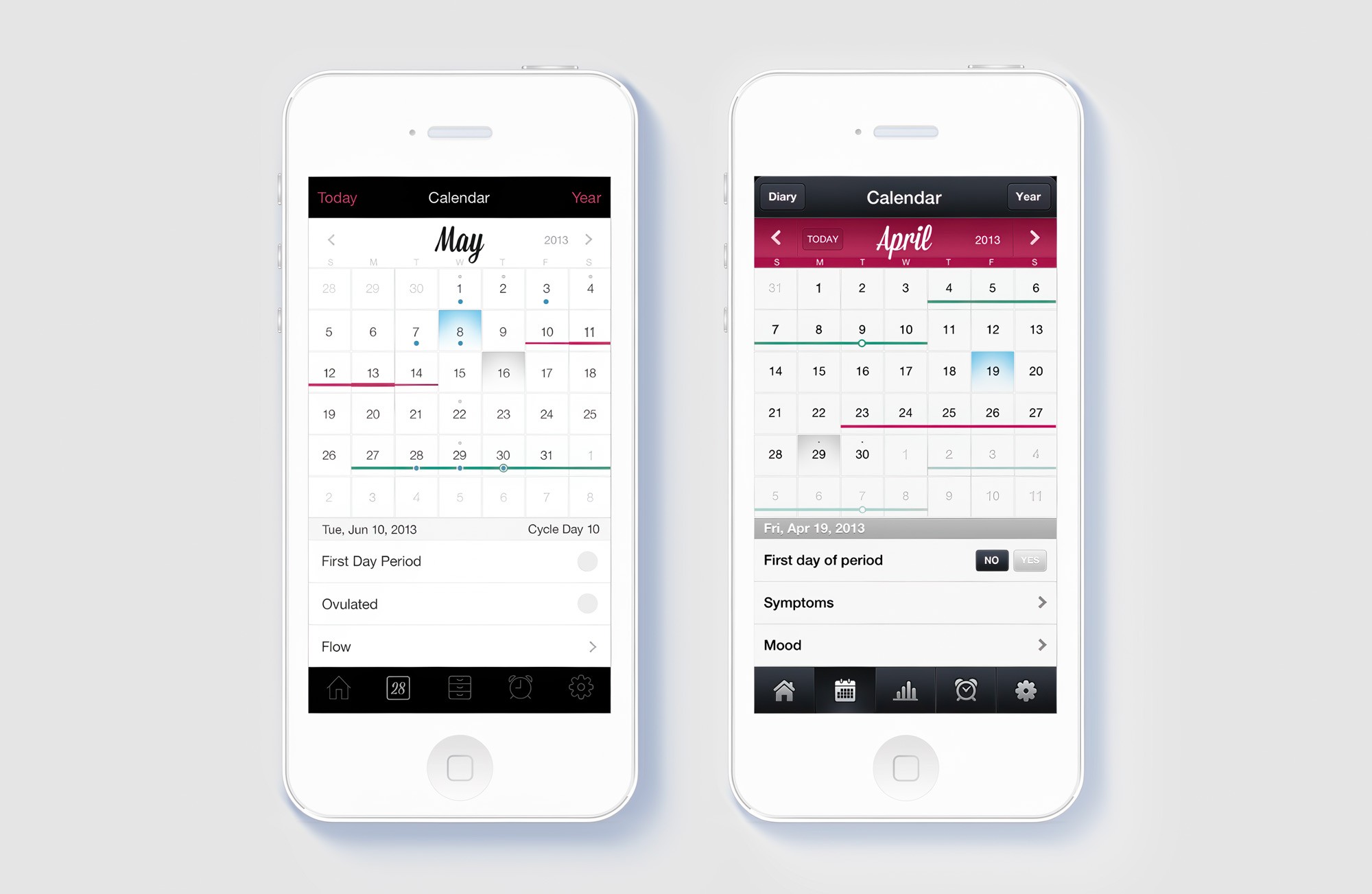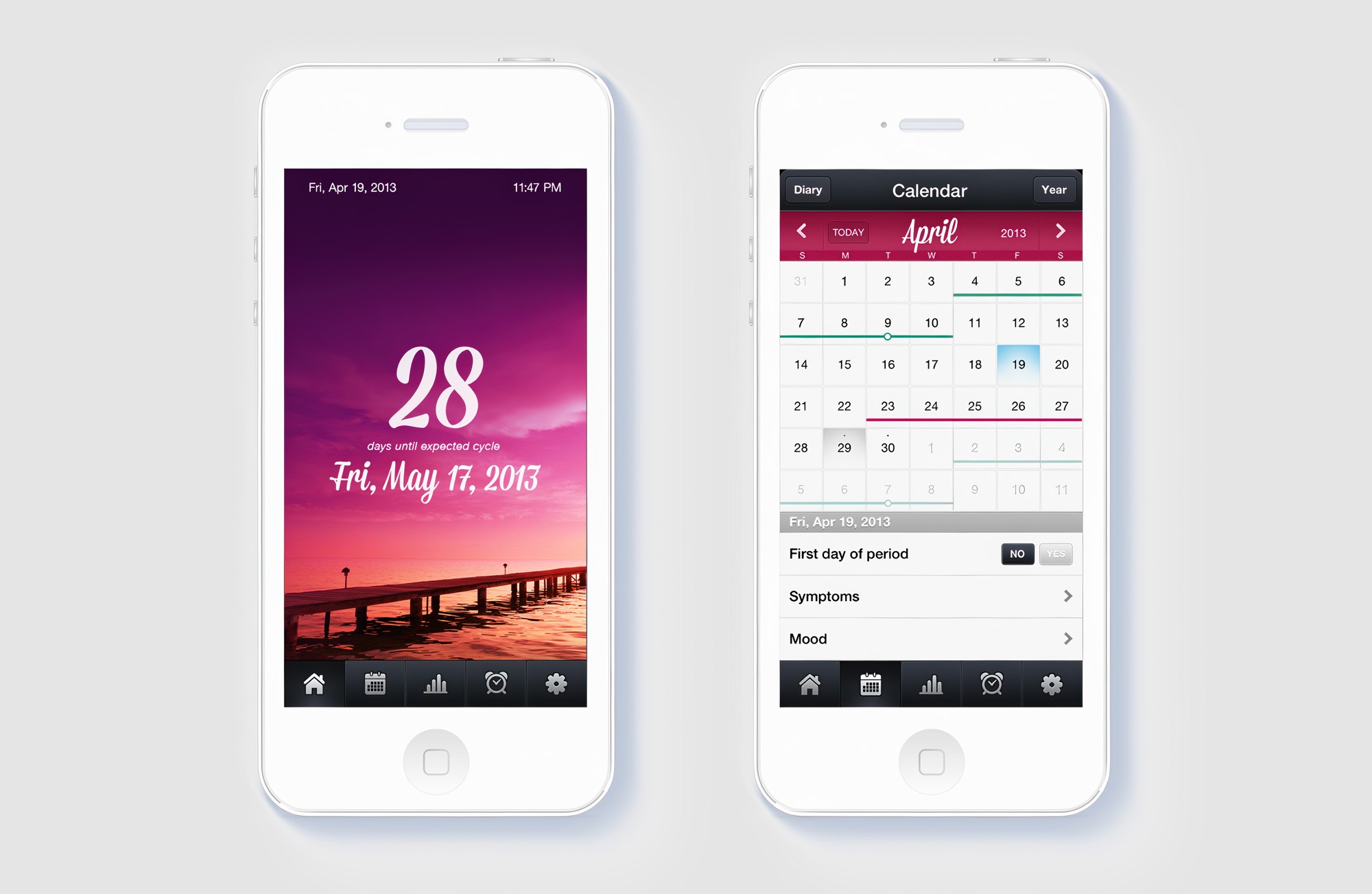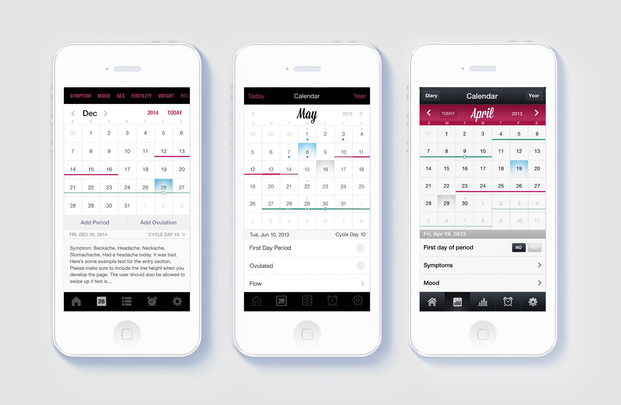 Interactive Calendar (Right): The calendar view introduces a high level of interactivity, allowing users to log essential data, such as the first day of their period, symptoms, and mood, directly from this screen. The design incorporates subtle color cues to highlight key dates, offering users a quick visual reference for their cycles.